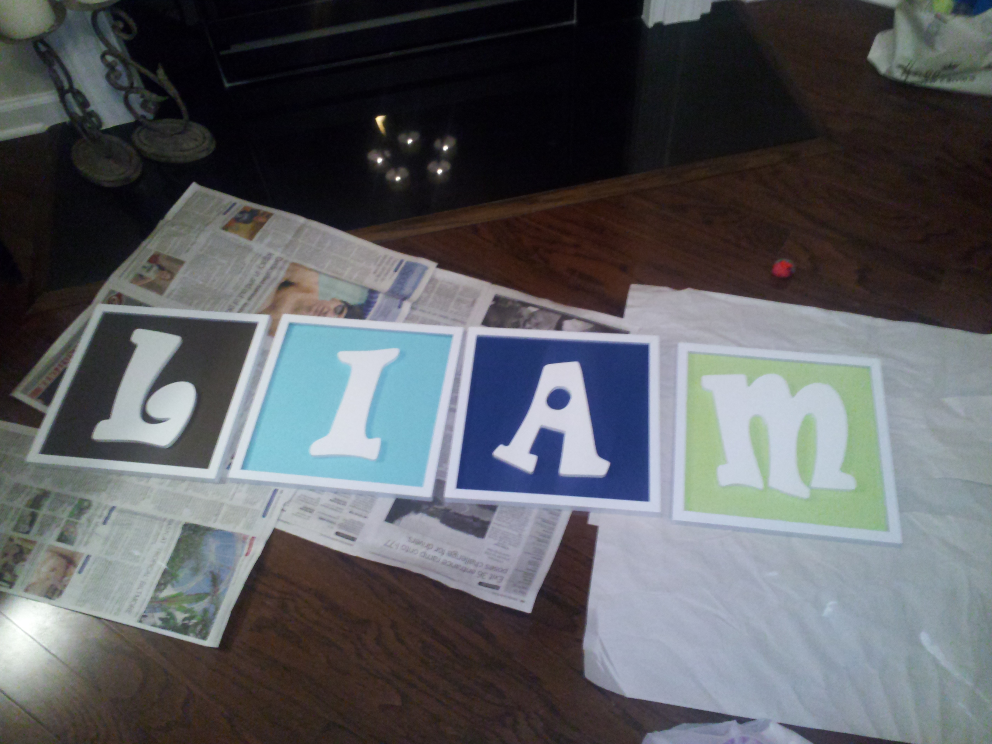 I’ve found so many pictures on Pinterest of cute nursery ideas and came across a picture of this letter-name-frame for Liam’s room. There was no tutorial, so I decided to make one. It’s super easy and you can vary the design to make it your own!